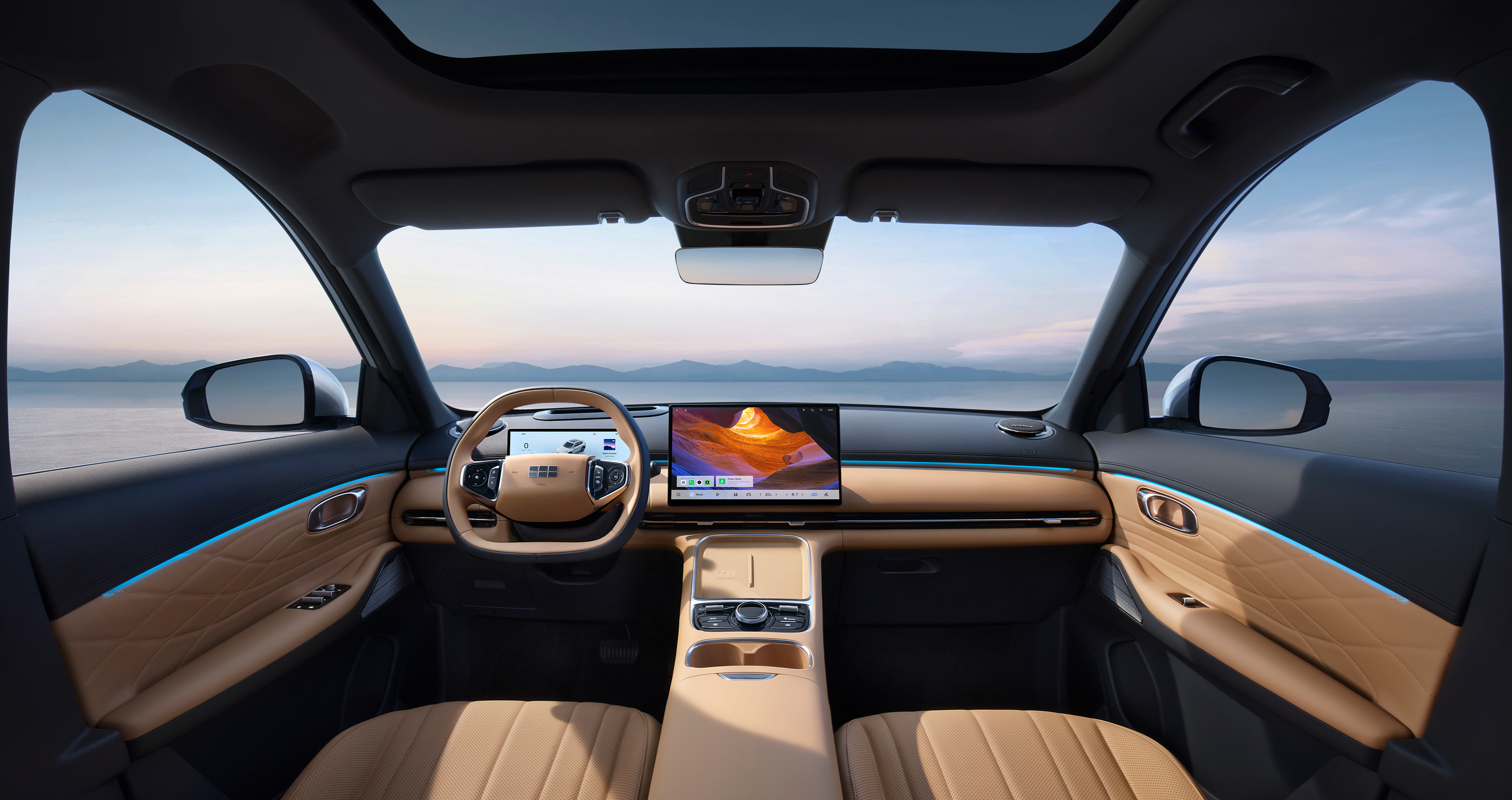 Интерьер Geely EX5 EM-i предусматривает два варианта цветового оформления. В качестве основного материала выступает высококачественная темно-синяя либо светло-коричневая экокожа. Управление основными функциями автомобиля осуществляется через экран мультимедийной системы диагональю 15,4”, а вся информация, предназначенная для водителя, выводится на 10,2-дюймовую цифровую приборную панель. Помимо высокого разрешения, центральный экран использует технологию LTPS (Low Temperature Poly Silicon), что гарантирует четкое изображение и плавную анимацию. Быстродействие — заслуга мощного процессора последнего поколения и сенсорной технологии INCELL, позволяющей точно фиксировать каждое касание. В свою очередь, пользоваться цифровыми возможностями Geely EX5 EM-i помогает операционная система Flyme Auto, а премиальная аудиосистема Flyme Sound с 16 динамиками и сабвуфером обеспечивает высококачественное звучание любых музыкальных композиций.