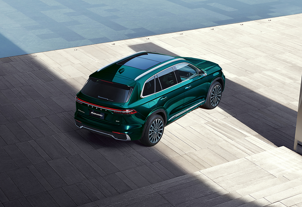 Экстерьер01Классический силуэт Geely Monjaro сочетает уверенность и мощь: агрессивная решётка радиатора с вертикальными ламелями и оптика с двойными горизонтальными ходовыми огнями делают модель узнаваемой. Версия Flagship SE выделяется глубоким зелёным цветом кузова Mountain Green и премиальными многоспицевыми 20‑дюймовыми дисками, подчёркивающими её статус и усиливающими выразительный образ.