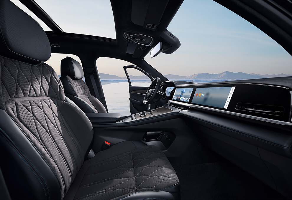 В салоне Monjaro Flagship SE сиденья отделаны экокожей и замшей с ромбовидной прострочкой, придающей салону роскошный вид.